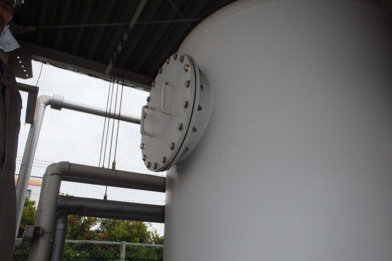 製薬工場 純水器樹脂交換 製薬工場では、UF膜だけではなく、イオン交換樹脂によっても純水を製造しています。使用水量や経年によって無機イオンの除去効果が低下するので、定期的に交換しています。