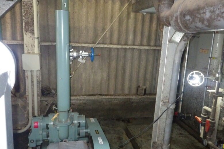 食品工場 ブロワー設置 排水を活性汚泥法にて処理するには、曝気槽内に空気を供給する必要があります。工事施工をした工場では曝気槽内の空気量が不足している為、ブロワを増設し、処理能力向上を図りました。 施工前 新品ブロワ 基…