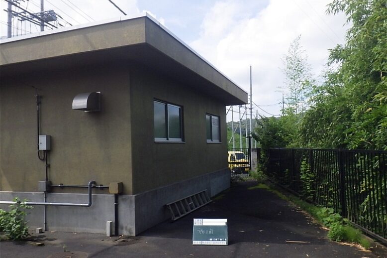 調整場 制御盤屋上移設工事 台風上陸によって調整場が浸水し、建物内の制御盤が被災した事を踏まえ、再び浸水しても同様の被害が出ないように、制御盤を建物屋上に移設しました。併せて屋上への階段を設置しました。