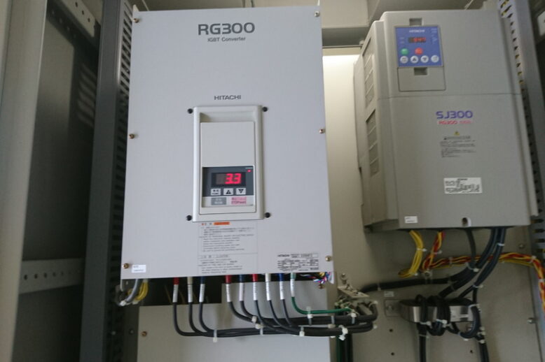 下水処理場 ポンプ用インバータ更新 下水処理場の電気室に設置している汚泥脱水関連機器用のインバータが、設置後年数が経過し、不具合が発生する前に新品に更新する工事を行いました。