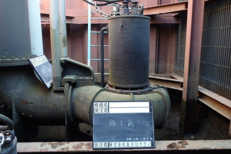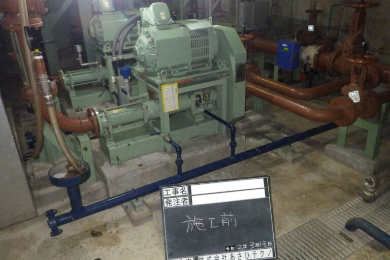 汚泥移送ポンプ更新 下水処理場に設置している汚泥移送ポンプが、経年劣化により腐食が発生し、正常な運転が出来なくなった事から、新品に更新する工事を行いました。