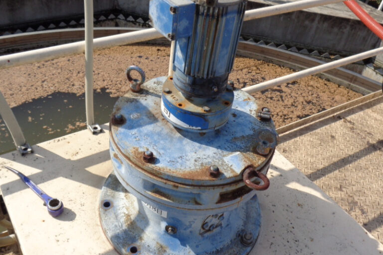 食品工場 沈殿槽掻寄機減速機交換 食品工場の廃水処理場に設置している沈殿槽掻寄機の減速機が、経年変化による故障により停止し、正常な廃水処理が不能になった為、減速機を交換する工事を行いました。工事実施日までの間は、浮上した…